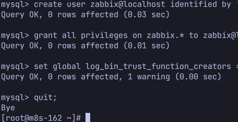 # zcat /usr/share/zabbix-sql-scripts/mysql/server.sql.gz | mysql --default-character-set=utf8mb4 -uzabbix -p zabbix